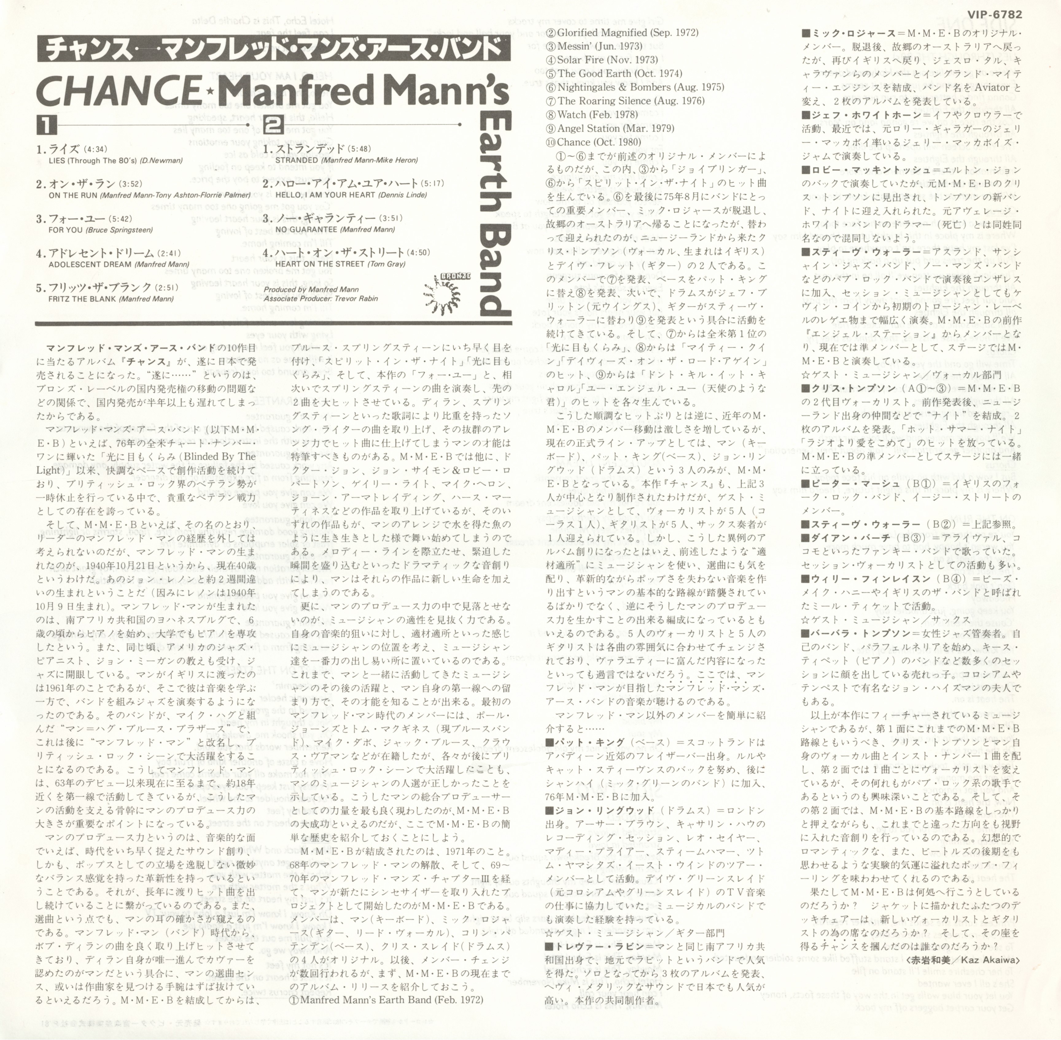 Manfred Manns Earth Band Chance : LP in jpn