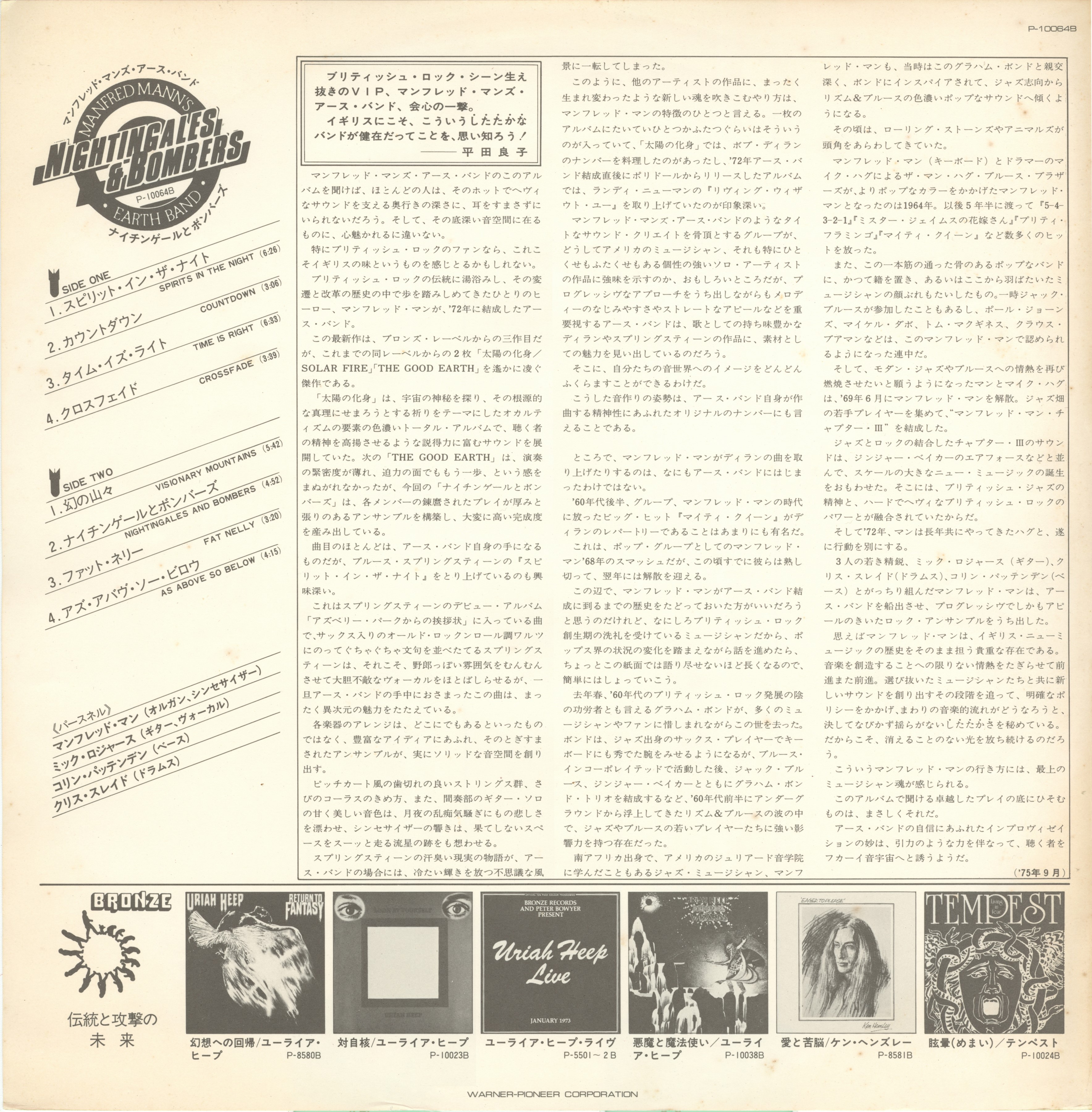 Manfred Manns Earth Band Nightingales & Bombers : LP Inlay 1 jpn